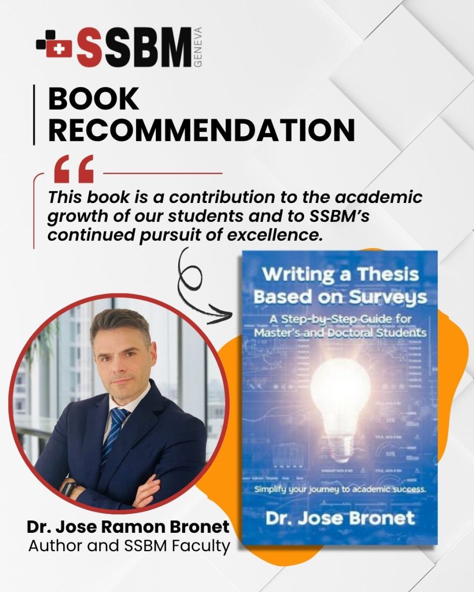 At SSBM Geneva, innovation in education extends beyond the classroom — it’s about creating tools that empower students to excel in their academic journeys. One shining example of this commitment is the new book Writing a Thesis Based on Surveys, authored by one of our esteemed faculty members, Dr. Jose Ramon Bronet.