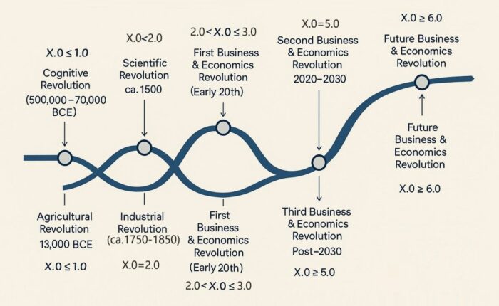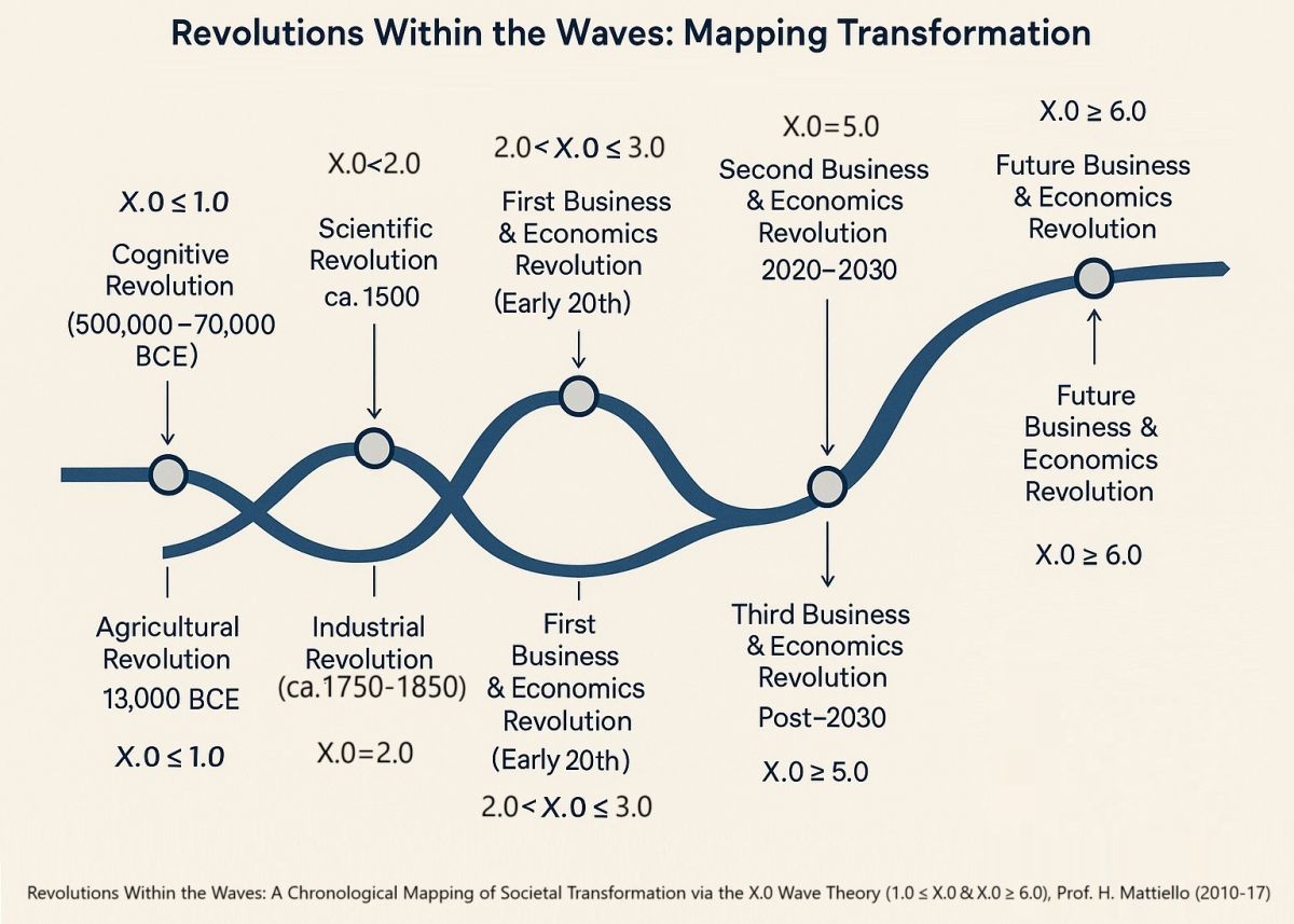 The X.0 Wave / Tomorrow’s Age Theory is a comprehensive framework I have developed, articulated, and advanced since 2010 to understand and anticipate the evolution of human civilization through successive technological and cultural ‘waves’ or ‘ages,’ with each Wave/Age (X.0) representing a distinct phase of human development. Each Wave/Age (X.0) represents a new phase in human development—from the Cognitive and Agricultural Ages (X ≤ 1.0) to the Industrial (X = 2.0), Information/Post-Industrial (X = 3.0), Intelligence/AI (X = 4.0), and Human-Centered (X = 5.0) Ages, eventually leading toward the Transhuman Age (X ≥ 6.0).