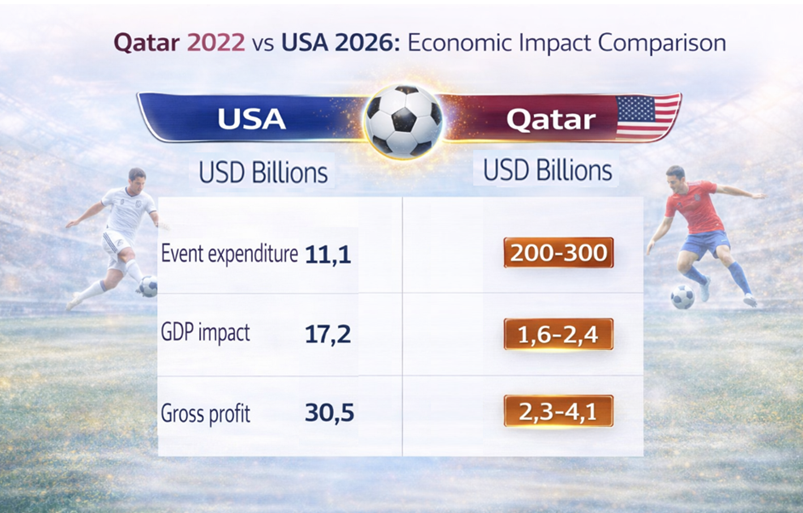 This is where the comparison between USA 2026 and Qatar 2022 becomes crucial. Qatar invested an estimated $200–300 billion, largely building infrastructure from scratch as part of a long-term national transformation strategy. While it achieved global visibility and prestige, the financial return remains highly debated due to the sheer scale of investment and uncertain long-term utilization. The United States, by contrast, is playing a completely different economic game. Instead of building new infrastructure, it is monetizing existing assets: stadiums, airports, hotels, and globally recognized cities. This dramatically lowers financial risk and shifts the model from “nation-building” to “value extraction”.