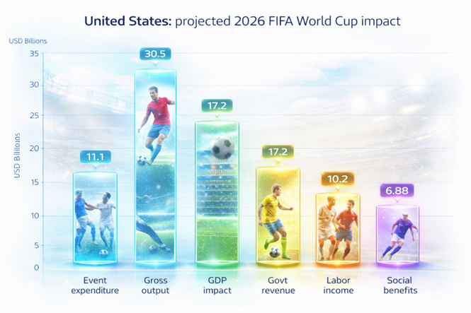 That is why the March 2025 FIFA–WTO–GoalEconomy impact analysis matters. It estimates that the FIFA World Cup 2026 could generate USD 30.5 billion in gross output[1] in the United States against global USD 80.1 billion, USD 17.2 billion in GDP, USD 10.2 billion in labor income, around 184,679 full-time-equivalent jobs, and USD 3.4 billion in government revenue. It also estimates USD 6.88 billion in extra-financial social benefits for the United States, with a social return on investment of 4.03.