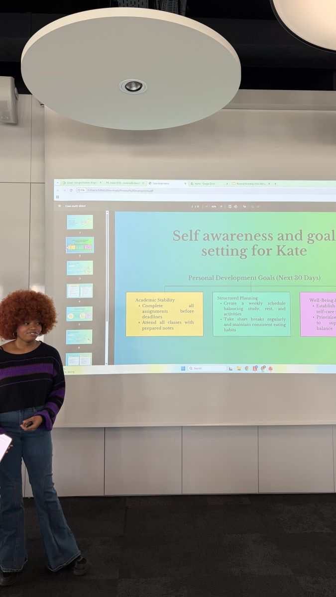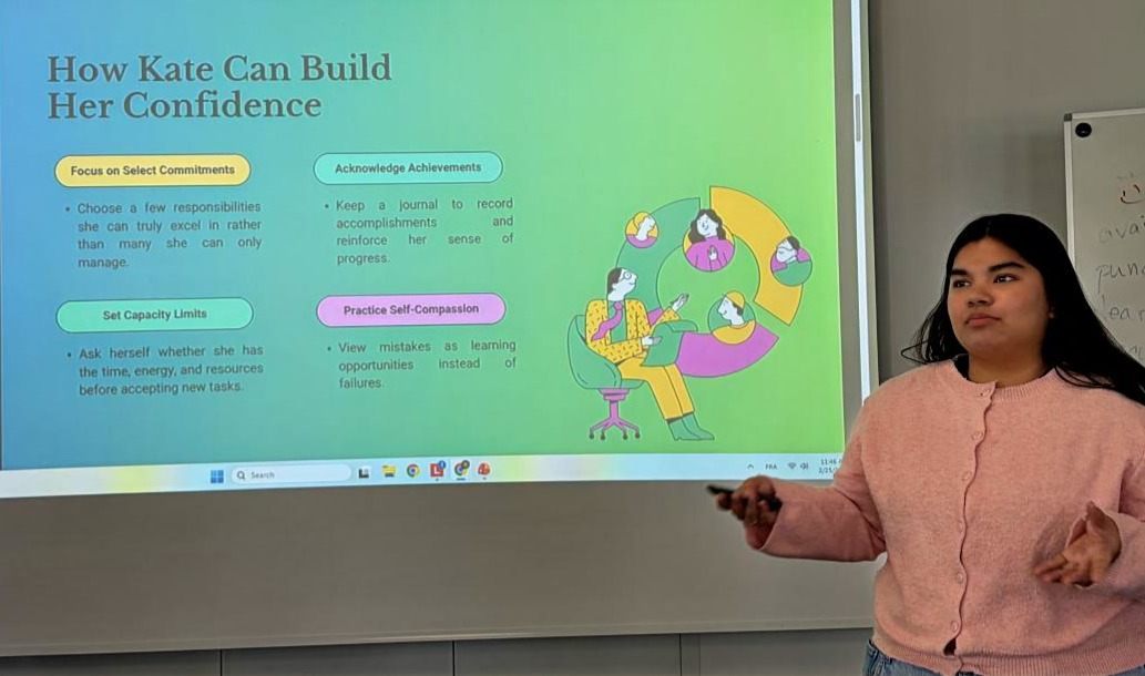 Students worked in groups to analyze Kate’s journey, evaluating the challenges she faced while balancing academic responsibilities, career goals, and personal life. Their presentations offered strategies to help Kate achieve a healthier balance between professional aspirations and personal fulfillment.